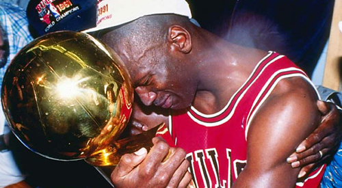 Jun 1991: Series MVP and guard Michael Jordan of the Chicago Bulls hugs the championship trophy while surrounded by his father and wife after the Bulls defeated the Los Angeles Lakers four games to one in the series at the Great Western Forum in Inglewoo